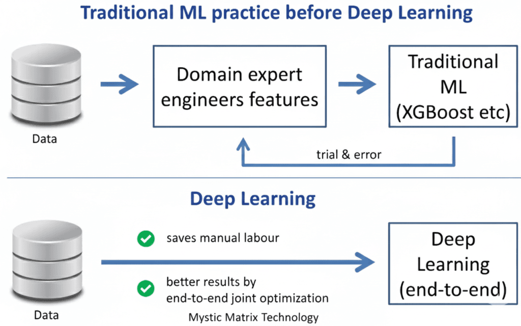 Traditional AutoML was built around tabular datasets — spreadsheets, relational tables, CSV files. But most real-world data today is multi-modal. Customer interactions include text, voice, and usage patterns. Security systems rely on video feeds, logs, and event streams. Healthcare relies on imaging, structured clinical records, genomics, and sensor data. AutoML 2.0 embraces this reality by providing native support for multi-modal learning, allowing different types of data to be combined into a single model.